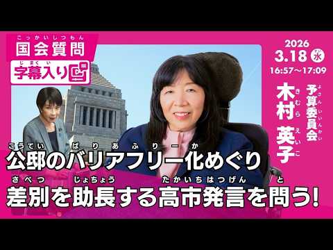 【字幕入り】「公邸のバリアフリー化めぐり 差別を助長する高市発言を問う!」木村英子 参議院 予算委員会(2026年3月18日)
