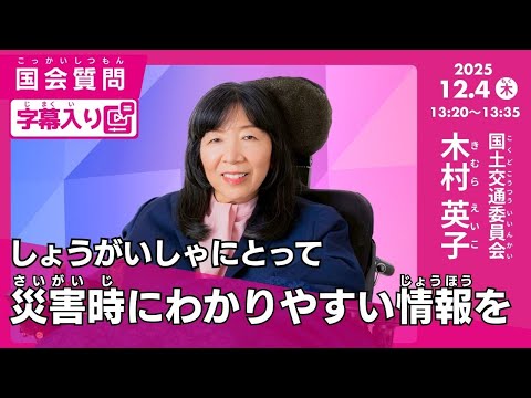 【字幕入り】「しょうがいしゃにとって 災害時にわかりやすい情報を」木村英子 参議院 国土交通委員会 気象業務法及び水防法改正案質疑(2025年12月4日)